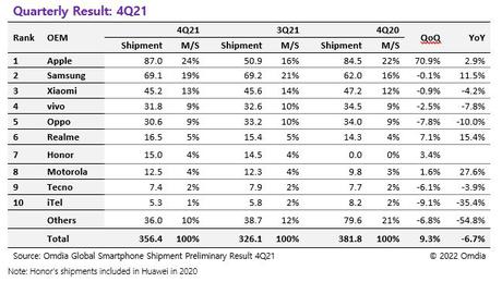 Omdia, w przeciwieństwie do Counterpoint, oferuje spojrzenie nie na pierwszą piątkę, ale na pierwszą dziesiątkę największych producentów. Według wyników IV kwartału liderem jest Apple z dostawami na poziomie 87 mln i 24% udziałem. Samsung sprzedał 69,1 mln smartfonów i zabrał 19%. Udział Xiaomi wyniósł 13% (45,2 mln sztuk).