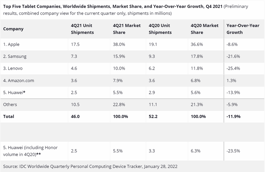 Na koniec 2021 r. firmy znajdują się w tej samej kolejności. Udział Apple wyniósł 34,2%, a wielkość dostaw 57,8 mln tabletów. Dla porównania, Samsung i Lenovo były w stanie dostarczyć łącznie 48,6 mln urządzeń, zajmując odpowiednio 18,3% i 10,5% rynku.
