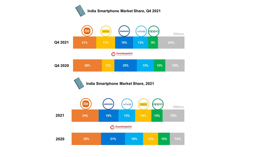 Zgodnie z wynikami wszystkich 2021 r. Xiaomi również przoduje. Zajęło 24% rynku, o 2% mniej niż w okresie bazowym. Udział Samsunga spadł z 21% do 18%, a żywych z 16% do 15%. Pomimo wyboistego ostatniego kwartału, realme zajęło czwarte miejsce (13% --> 14%). Ostatecznie OPPO utrzymało się na dolnym poziomie 10% w pierwszej piątce.