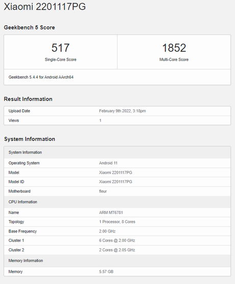 Smartfon wymieniony w dokumentach z numerem modelu 2201117PG. Wyciek potwierdza, że ​​nowy produkt będzie zasilany ośmiordzeniowym, 12-nanometrowym procesorem MediaTek Helio G96. Dodatkowo urządzenie otrzyma po wyjęciu z pudełka 6 GB pamięci RAM i system operacyjny Android 11.