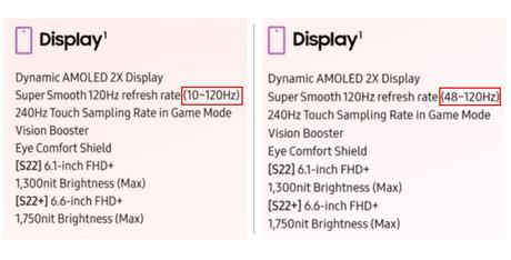 Początkowo w informacja prasowa Galaxy S22 i S22+ mają być wyposażone w wyświetlacze Dynamic AMOLED 2X z adaptacyjną częstotliwością odświeżania od 10 Hz do 120 Hz. Jednak kilka dni później firma skorygowała te wartości i wskazała częstotliwość od 48 do 120 Hz.