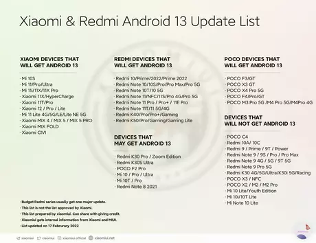 Po pierwsze, entuzjaści Xiaomiui zauważają, że Android 13 będzie dostępny dla 23 smartfonów Xiaomi. To prawda, że ​​na tej liście znalazły się niezapowiedziane Xiaomi MIX 5 i MIX 5 Pro, a także Xiaomi 12 Lite. Zapewne dotyczy to Xiaomi 12X.