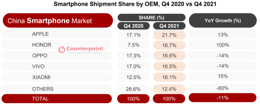 Honor był na drugim miejscu po Apple, który zwiększył swoje dostawy o 13% i swój udział z 17,1% do 21,7%. 14-procentowy spadek OPPO wysłał byłego lidera rynku na trzecie miejsce. Udział zmniejszył się z 17,3% do 16,6%. Vivo oddycha z tyłu, kontrolując 16,5% rynku wobec 17% w okresie bazowym. W ciągu ostatnich trzech miesięcy 2021 roku sprzedała też o 14% mniej smartfonów niż w tym samym okresie w 2020 roku.