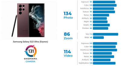 Niestety, pomimo swojej ceny, Galaxy S22 Ultra nie znalazł się w pierwszej dziesiątce najlepszych telefonów z aparatem. Jego średni wynik to 131: 134 za zdjęcie, 86 za zoom i 114 za wideo.