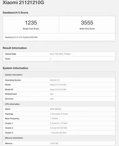 Telefon Xiaiomi 21121210G uważany za Poco F4 GT pojawił się na liście Geekbench, ujawniając, że rzeczywiście jest zasilany przez najnowszy flagowy chipset Qualcomm wraz z 12 GB pamięci RAM. Telefon działa na Androidzie 12, prawdopodobnie z MIUI 13 Xiaomi na górze i zarządza 1235 punktami w teście jednordzeniowym i 3555 punktami w teście wielordzeniowym.