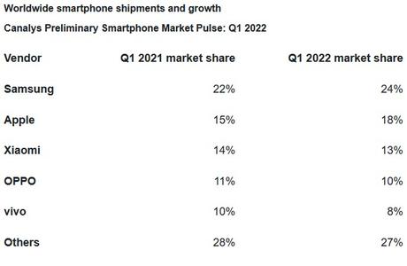 Z roku na rok przywództwo Samsunga pozostaje niezmienione: udział południowokoreańskiego producenta w pierwszym kwartale wyniósł 24%, co stanowi wzrost o 2% w porównaniu z tym samym okresem w 2021 roku. Jak twierdzą analitycy, Samsung przyspieszył produkcję swojej popularnej serii A, aby agresywnie konkurować w segmentach średnich i budżetowych, a także zaktualizował swoje portfolio na 2022 r. o flagową serię Galaxy S22.