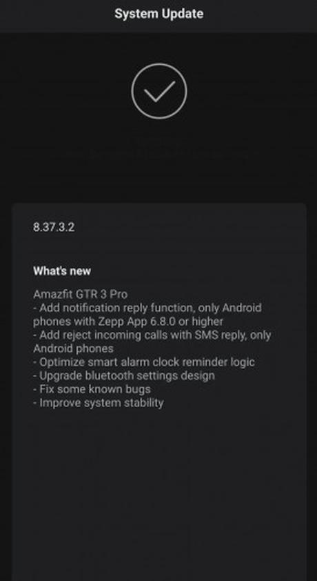 GTR 3 Pro zyskuje dodatkową korzyść w postaci niestandardowych odpowiedzi na powiadomienia za pośrednictwem aplikacji Zepp na Androida. Inne ulepszenia w gamie GT 3 obejmują zoptymalizowane inteligentne przypomnienia budzika, łączność Bluetooth i ogólną stabilność systemu. Oprócz aktualizacji oprogramowania układowego zegarka użytkownicy powinni również upewnić się, że korzystają z najnowszej aplikacji Zepp na swoich telefonach.
