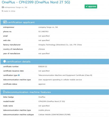 OnePlus Nord 2T 5G posiada certyfikat NBTC