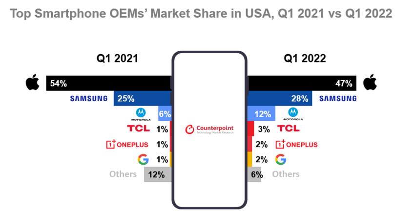 Również w pierwszej piątce TCL, Jeden plus oraz Google. Ich udziały wynosiły odpowiednio 3%, 2% i 2% wobec 1% w I kwartale 2021 roku. Nawiasem mówiąc, ten ostatni zwiększył dostawy o 152%. Wszyscy pozostali producenci łącznie dostarczyli na rynek amerykański 6% smartfonów (było to 12%).