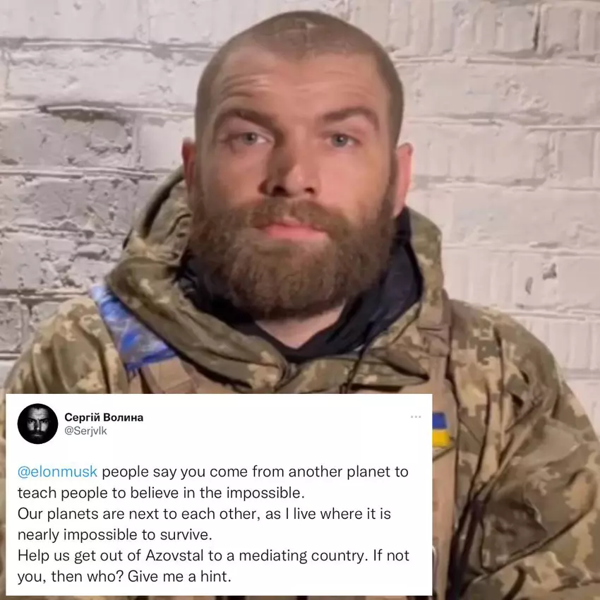 Dowódca 36. Brygady Morskiej Sił Zbrojnych Ukrainy Siergiej Wołyński („Wołyń”), opublikowany w Świergot oraz Facebook apel do Elona Muska z prośbą o pomoc w ewakuacji ukraińskich obrońców z Azowstalu w Mariupolu.