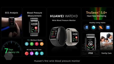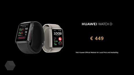 Drugi zegarek to Huawei Watch D. Wyposażony jest w prostokątny wyświetlacz 1,64” o rozdzielczości 280 x 456 pikseli. NFC, ochrona IP68, Wi-Fi/Bluetooth, GPS i funkcja EKG są również na miejscu. Chip zegarka to zintegrowany tonometr. Ten model będzie kosztował 449 euro.