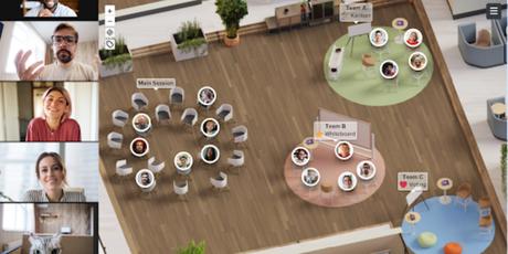 Welo na przykład odtwarza przestrzeń współpracy. Uczestnicy mogą widzieć wszystkich i przechodzić między rozmowami.