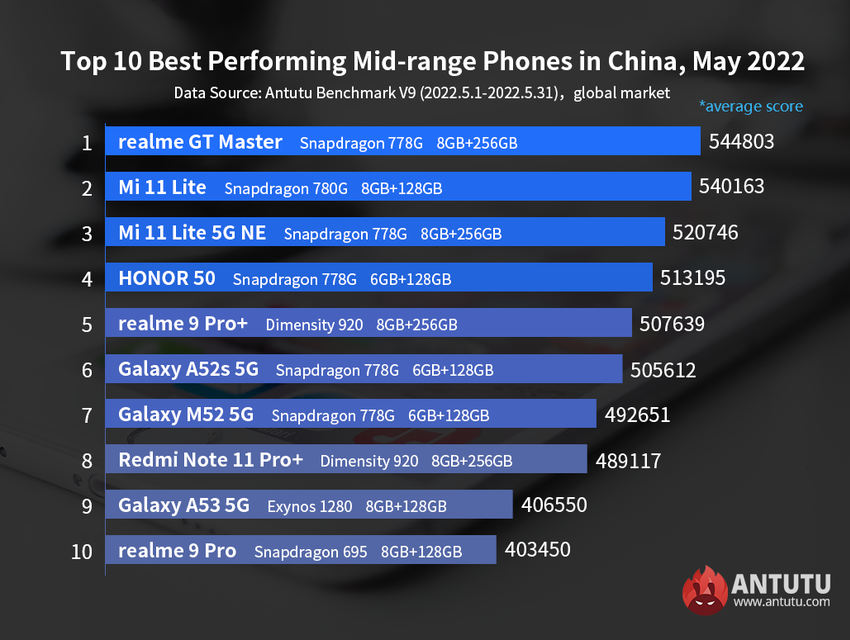 AnTuTu opublikował dwie oceny wydajności dla smartfonów średniej klasy sprzedawanych na całym świecie.