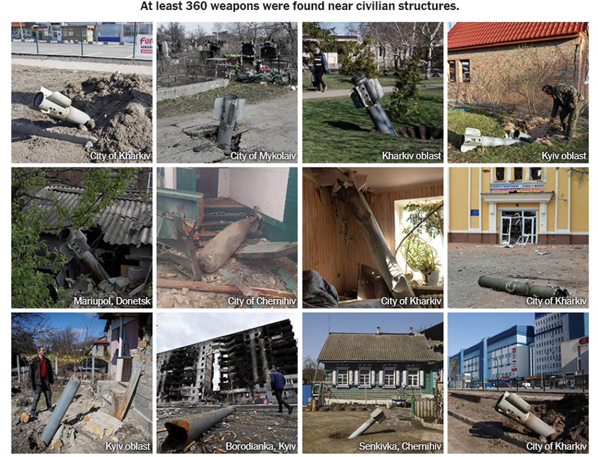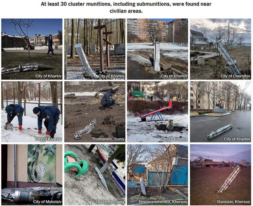 W artykule New York Times Wymieniono amunicję do metalowych gwoździ i amunicję fosforową. Autorzy materiału uważają, że największym zagrożeniem dla ludności cywilnej są niewybuchy, które mogą pozostawać w ziemi przez dziesięciolecia.