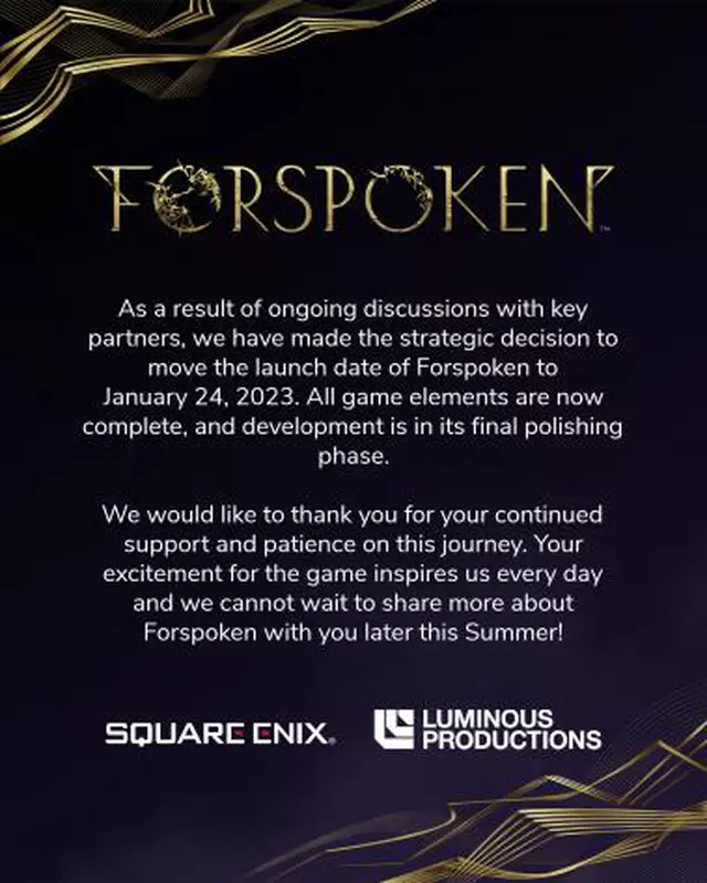W odwołaniu zespół wyjaśnia, że do takiej decyzji doszedł po długich dyskusjach z kluczowymi partnerami. „Wszystkie elementy gry są gotowe. Produkcja jest na końcowym etapie polerowania.” - mówi wiadomość. Deweloperzy podziękowali fanom za wsparcie i obiecali, że jeszcze tego lata opowiedzą więcej o Forspoken. Przygoda prawdopodobnie pojawi się na targach gamescom 2022.