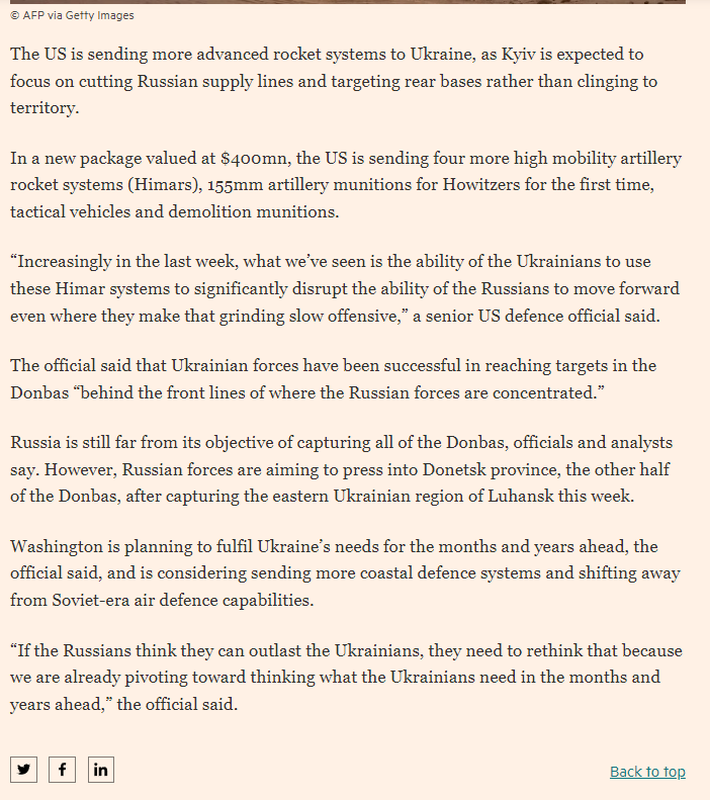 Wszystkie odnoszą się do materiał Czasy finansowe , który ukazał się wieczorem 8 lipca pod hasłem „USA wysłać 400 mln dolarów sprzętu wojskowego na Ukrainę”. Jednak tekst nigdy nie wspomina ani o zwiększonym zasięgu, ani konkretnie o 300 km. Jeśli witryna wymaga subskrypcji, możesz skopiować tytuł i przejść przez Google. Jeśli jesteś zbyt leniwy, aby to zrobić, oto zrzut ekranu całej wiadomości Czasy finansowe: