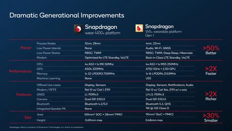 Amerykański producent zmienił markę i nazwał nowe Snapdragon W5 i Snapdragon W5+ Gen 1. Są następcami Snapdragon Wear 4100 i Lwia paszcza Wear 4100+. Układy różnią się jedynie dodatkowym koprocesorem AON (dostępnym tylko w wersji Plus). Odpowiada za ekstremalny tryb oszczędzania energii. Pozostałe SoC są identyczne.