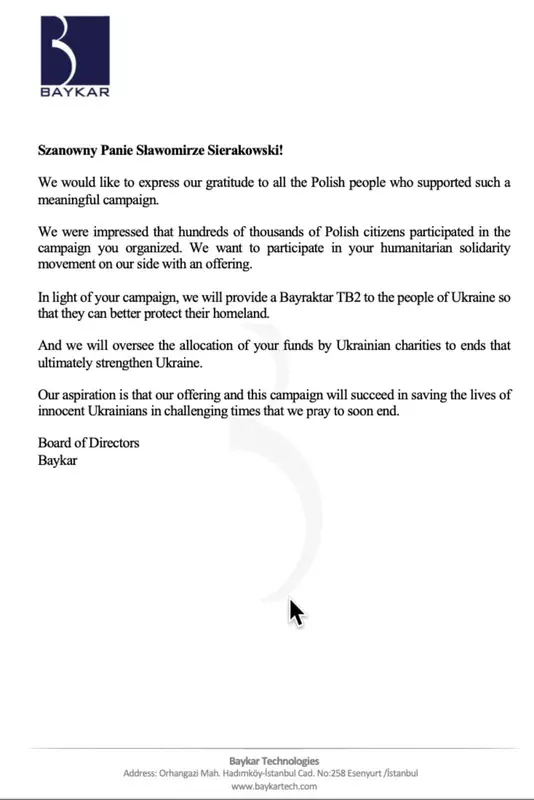 Baykar Technologies przekaże Ukrainie kolejny dron uderzeniowy Bayratktar TB2 za darmo - w Polsce zebrano na niego ponad 5 000 000 dolarów