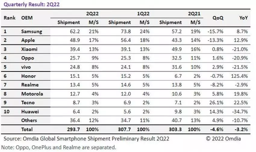 Zgodnie z wynikami badania od kwietnia do czerwca dostarczono łącznie 293,7 mln smartfonów. Dla porównania w pierwszym kwartale było to 307,7 mln, aw drugim kwartale ubiegłego roku 303,3 mln. Oznacza to, że w drugim kwartale 2022 r. sprzedaż spadła.