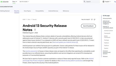 Tymczasem łata bezpieczeństwa na poziomie 2022-09-01 wskazuje, że Android 13 pojawi się we wrześniu, choć może to być dopiero debiut AOSP (Android Open Source Project). Urządzenia z systemem Android 13 z poziomem poprawki zabezpieczeń 2022-09-01 lub nowszym są chronione przed tymi problemami (Android 13 wydany w systemie AOSP będzie miał domyślny poziom poprawki zabezpieczeń 2022-09-01).