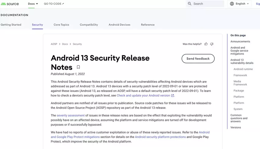Tymczasem łata bezpieczeństwa na poziomie 2022-09-01 wskazuje, że Android 13 pojawi się we wrześniu, choć może to być dopiero debiut AOSP (Android Open Source Project). Urządzenia z systemem Android 13 z poziomem poprawki zabezpieczeń 2022-09-01 lub nowszym są chronione przed tymi problemami (Android 13 wydany w systemie AOSP będzie miał domyślny poziom poprawki zabezpieczeń 2022-09-01).