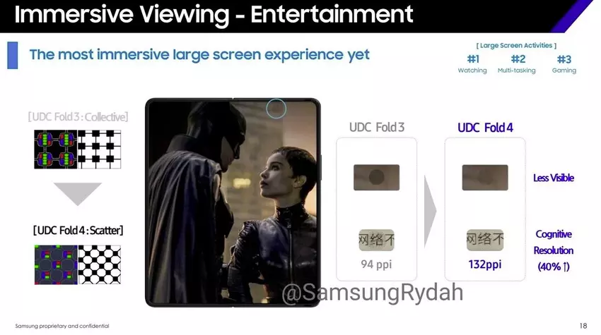 Zgodnie z ujawnionymi slajdami model użyje innego rozmieszczenia pikseli, aby ekran był gęstszy, co spowoduje powstanie koła o rozdzielczości 132 ppi zamiast 94 ppi w Galaxy Z Fold 3. W rezultacie otwór powinien być mniej widoczny, a tekst w ten obszar jest mniej postrzępiony. Niestety, sądząc po wyciekających slajdach, nie jest to całkowicie niezauważalne.
