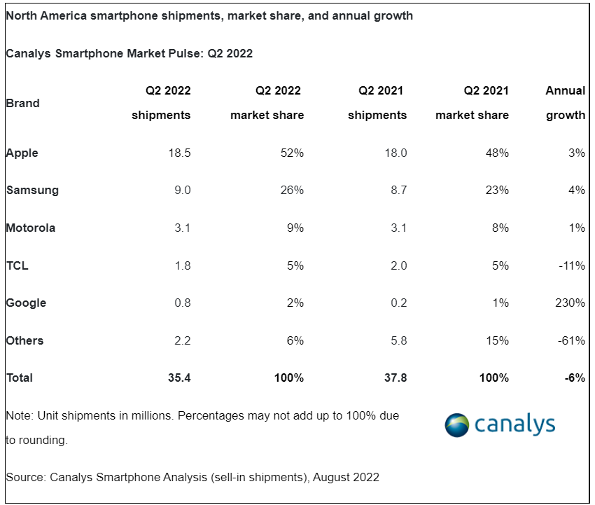 Jabłko pozostaje niekwestionowanym liderem z udziałem 52% i sprzedażą 18,5 miliona smartfonów. SAMSUNG kontroluje 26% (9 milionów sztuk) rynku amerykańskiego. Dotarł do pierwszej 5 Motorola (9%, 3,1 mln sztuk), TCL (5%, 1,8 mln sztuk) i Google (2%, 0,8 mln sztuk). Wszystkie pozostałe firmy łącznie mają udział 6% (2,2 mln sztuk)