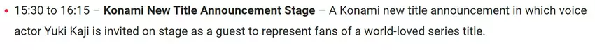 Wystawa odbędzie się w dniach 15-18 września Tokyo Game Show 2022, w którym Konami planuje wydać ogłoszenie na światowym poziomie. Stało się znane od opublikowany lista wydarzeń, które będzie gospodarzem Konami.