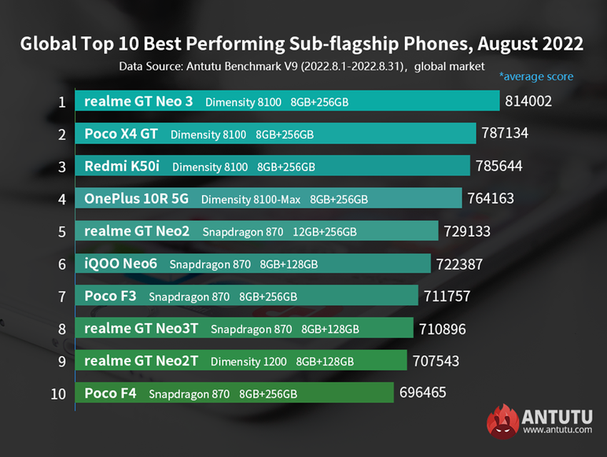 Realme GT Neo 3 zasilany przez Dimensity 8100 prowadzi na pierwszej liście z wynikiem 814 002 punktów i jest jedynym smartfonem w pierwszej dziesiątce, który przekroczył granicę 800 000. Trzy najlepsze to POCO X4 GT i Redmi K50i z tym samym układem mobilnym.