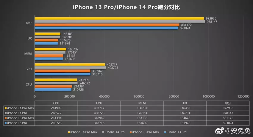 Zgodnie z oczekiwaniami, nowe produkty były mocniejsze od swoich poprzedników. Podczas prezentacji Apple twierdziło, że A16 Bionic zużywa o 20% mniej energii w porównaniu do A15 Bionic o tej samej wydajności. Jeśli wierzyć AnTuTu, ogólna wydajność iPhone'a 14 Pro w porównaniu z iPhone'em 13 Pro wzrosła o 17%. Kluczową przewagę zapewniają CPU i GPU - odpowiednio +12,86% i +26,57%.