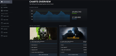 Strona "Bestsellery i najpopularniejsze gry na Steam" została całkowicie zmieniona. Teraz możesz zobaczyć ilu użytkowników jest teraz online, najlepiej sprzedające się gry w danym tygodniu i miesiącu, najpopularniejsze gry i najlepsze wydania miesiąca. Na tej stronie znajdą się również linki do ankiet sprzętowych, statystyk pobrań oraz statystyk wsparcia Steam.