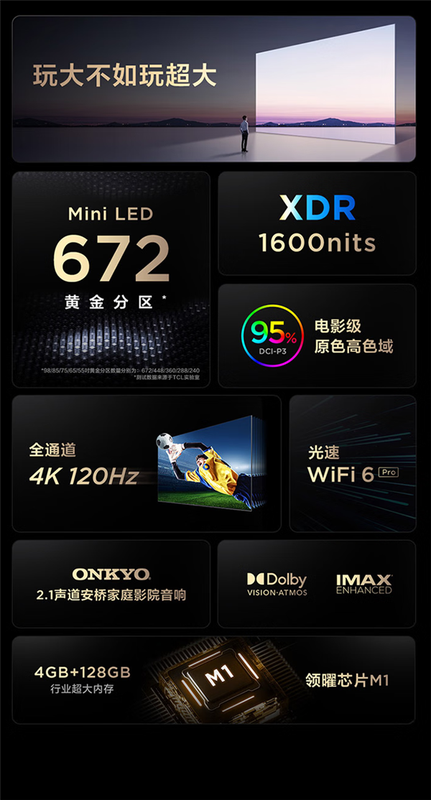 Nowość może pochwalić się 98-calowym ekranem Mini LED o jasności 1600 nitów i kontraście 16 000 000:1. Panel ma rozdzielczość 4K i częstotliwość odświeżania 120 Hz. Ekran pokrywa 95% palety barw DCI-P3. Urządzenie działa na czterordzeniowym procesorze sparowanym z 4GB pamięci RAM i 128GB pamięci masowej. W nowości zainstalowano również system audio z 2.1 kanałem, 7 głośnikami i mocą 50W. Telewizor obsługuje także Dolby Atmos i Wi-Fi 6 Pro. Z portów nowość ma trzy HDMI 2.1, dwa USB i jedno wejście AV.