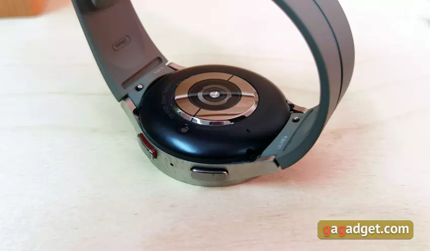 Na tylnej ściance zegarka znajduje się całkiem sporo. W poprzedniej generacji wszystko było wykonane ze szkła i ceramiki. Teraz główna część jest plastikowa, a jedynie elektrody czujników są szklane. A jest ich bardzo dużo. Biosensory Samsung BioActive, optyczny czujnik tętna i czujnik temperatury na podczerwień. W linii Galaxy Watch5 nie ma funkcji bezpośredniego pomiaru temperatury (przynajmniej na razie), a czujnik jest wykorzystywany w kompleksowym śledzeniu kondycji ciała. Dodatkowo z tyłu znajduje się otwór do odciążenia.