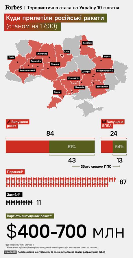 Według Walerija Zaluznego, głównodowodzącego AFU, okupanci wystrzelili na terytorium Ukrainy 84 rakiety. Według Dowództwa Sił Powietrznych są to rakiety Kh-101, Kh-555, Kalibr, Iskander, S-300 i Tornado. A to nie uwzględnia dużej liczby dronów.