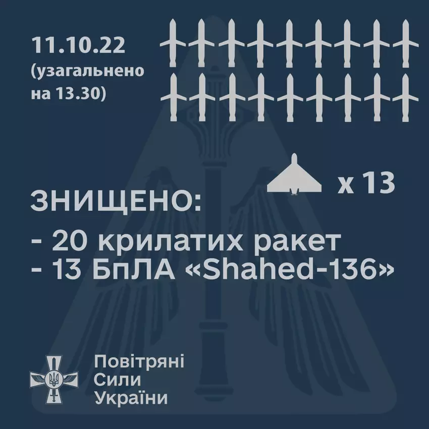 Łączna liczba zestrzelonych dronów jest znacznie wyższa: według dowództwa sił powietrznych AFU na godzinę 13:30 11 października zestrzelono już 20 pocisków cruise i 13 UAV Shahed-136.
