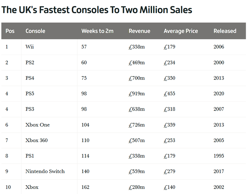 PlayStation 5 to najbardziej dochodowa konsola w rankingu. Przez 98 tygodni konsola przyniosła 919 milionów funtów szterlingów. Gamesindustry opublikowało także informację o najszybszej sprzedaży konsoli w Wielkiej Brytanii, która osiągnęła dwa miliony egzemplarzy.