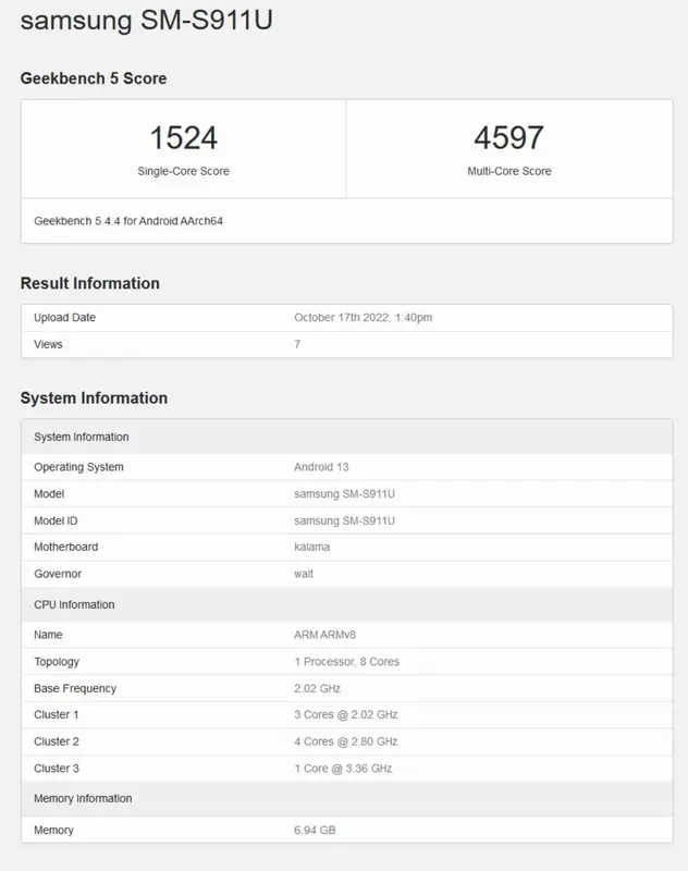 Benchmark sprawdził wydajność flagowego smartfona Samsunga Galaxy S23. Posiada 8 GB pamięci RAM i działa pod kontrolą systemu operacyjnego Android 13. Według Geekbench, układ będzie miał szczytową częstotliwość 3,36GHz. "Średni" blok rdzeni to 2,8GHz, a "mały" blok rdzeni to 2,02GHz. Dla porównania, Snapdragon 8 Gen1 ma częstotliwości odpowiednio 3,2GHz, 2,75GHz i 2GHz.