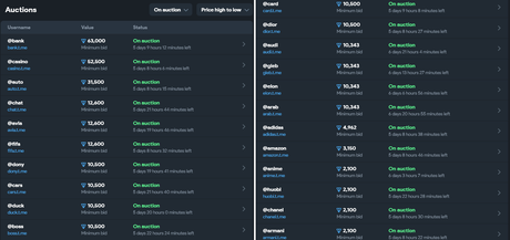 Możesz licytować tylko w walucie Toncoin. Twoja nazwa użytkownika musi mieć co najmniej cztery znaki. Na platformie Fragment jest już kilka krótkich nazw. Na przykład @elon, @audi, @fifa, @dior, których ceny wahają się od 19 000-25 000 dolarów. Najdroższą działką jest @bank. Minimalna oferta za niego wynosi obecnie ponad 100 tys. dolarów.