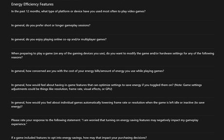Windowscentral podzielił się również zrzutem ekranu z pytaniami od Microsoftu. W ankiecie zapytano użytkowników, czy byliby zainteresowani funkcjami zmniejszającymi zużycie energii w grach, zarówno podczas pracy, jak i w trybie czuwania.