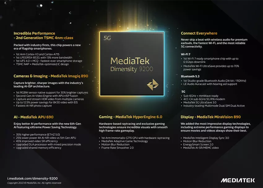 Nowość otrzymała nazwę MediaTek Dimensity 9200. Układ zbudowany jest na 4-nanometrowym procesorze drugiej generacji firmy TSMC. Dzięki temu pobór mocy został zmniejszony o 25%.