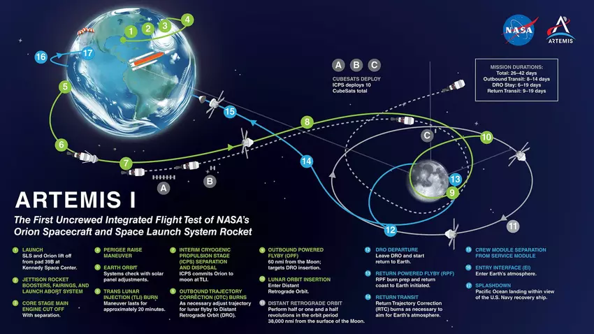 Orion wykorzysta swój drugi stopień do dotarcia do wcześniej ustalonego celu, a następnie wyruszy samodzielnie w kierunku Księżyca. Podróż potrwa 25,5 dnia. W tym czasie statek kosmiczny ominie naturalnego satelitę Ziemi i powróci na planetę 11 grudnia 2022 roku.