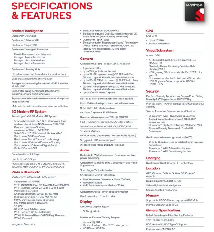 Jeśli chodzi o pozostałą specyfikację Snapdragona 782G, to pozostaje ona bez zmian. SoC otrzymał wsparcie dla technologii szybkiego ładowania Quick Charge 4+, Wi-Fi 6, aparatów do 200 MP oraz modemu Snapdragon X53 5G. Może działać w sieciach sub-6GHz i mmWave.