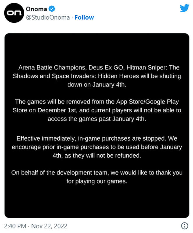 "Obecni gracze nie będą mieli dostępu do gier po 4 stycznia" - czytamy w tweecie od nieistniejącego już studia Onoma, które widzi także trzy darmowe gry (Arena Battle Champions, Hitman Sniper: Shadows i Space Invaders: Hidden Heroes) wyłączone. "Zalecamy, abyście wykorzystali swoje przedpremierowe zakupy w grze przed 4 stycznia, ponieważ nie podlegają one zwrotowi."