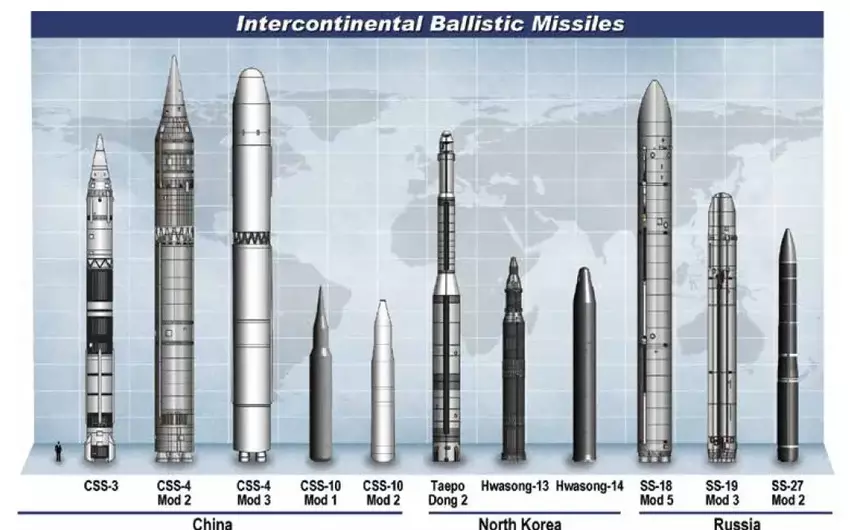 R-36M2 ma całkowitą długość 37,25 metra, średnicę około 3 metrów i masę 211 ton z pełnym ładunkiem użytecznym. Wymiary pocisków międzykontynentalnych Chin, Rosji i KRLD można oszacować na poniższym obrazku.