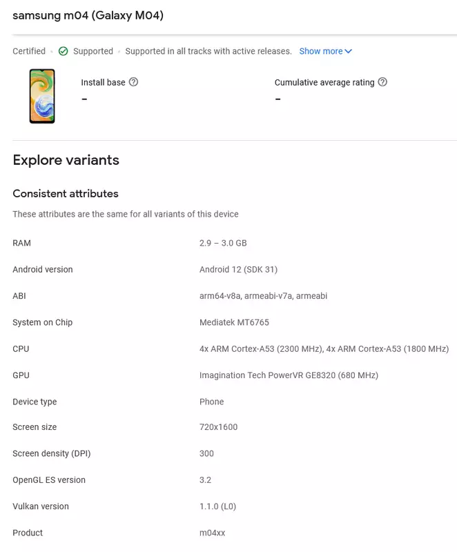 Mowa o modelu Galaxy M04. Smartfon pojawił się w bazie Google Play Console. Według przecieku, gadżet będzie napędzany przez ośmiordzeniowy procesor MediaTek Helio G35 sparowany z 3GB pamięci RAM.