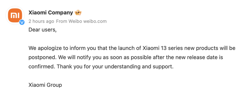 Xiaomi poinformowało, że przesuwa premierę swoich flagowych smartfonów Xiaomi 13 i Xiaomi 13 Pro.