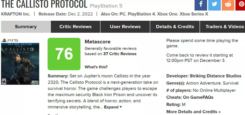 W dniu premiery The Callisto Protocol na agregatorach zaczęły pojawiać się pierwsze recenzje i oceny gry.