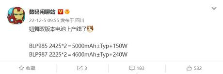 Ujawnił to chiński insider Digital Chat Station. Według przecieku, gadżet będzie nosił nazwę Realme GT Neo 5. Nowość trafi na rynek w dwóch wersjach: bazowej GT Neo 5 (BLP985) i topowej GT Neo 5T (BLP987). Pierwszy z nich otrzyma baterię o pojemności 5000 mAh i szybkie ładowanie 150 W, natomiast drugi baterię o pojemności 4600 mAh i wsparcie ładowania do 240 W. Jeśli plotki się potwierdzą, będzie to smartfon z najszybszym ładowaniem na świecie. Podobno urządzenie ma się ładować od 0 do 100% w mniej niż 10 minut.