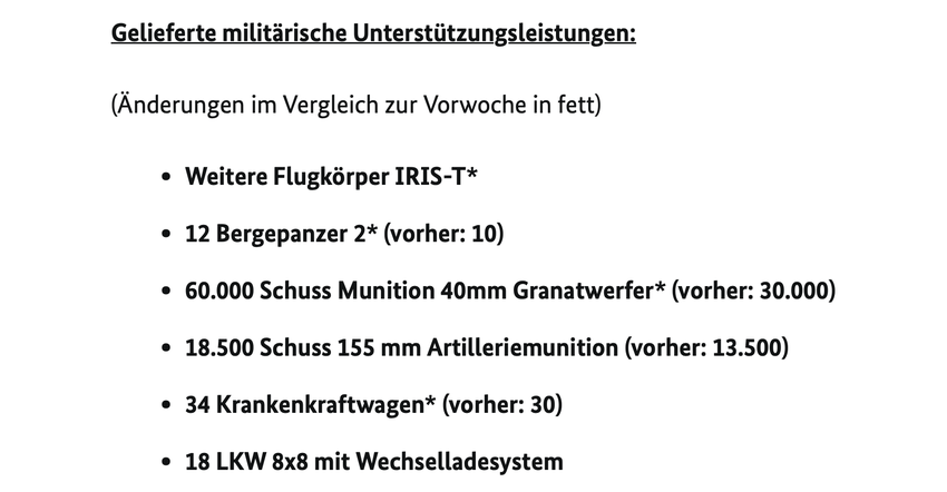 Oprócz tego Ukraina otrzymała 2 opancerzone pojazdy ratownicze Bergepanzer 2, 18 ciężarówek z układem kół 8x8 i specjalnym systemem załadunku (Wechselladesystem), 30 tys. pocisków do granatników 40-mm, 5 tys. sztuk amunicji artyleryjskiej 155-mm oraz 4 ambulanse.