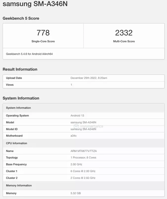 Smartfon będzie wyposażony w układ Dimensity 1080. Samsung Galaxy A34 5G przeszedł test wydajności w Geekbench. Układ pracuje z częstotliwością 2-2,6 GHz, grafiką Mali-G68, modemem wspierającym łączność komórkową 5G i wykonany jest w technologii 6 nm TSMC.